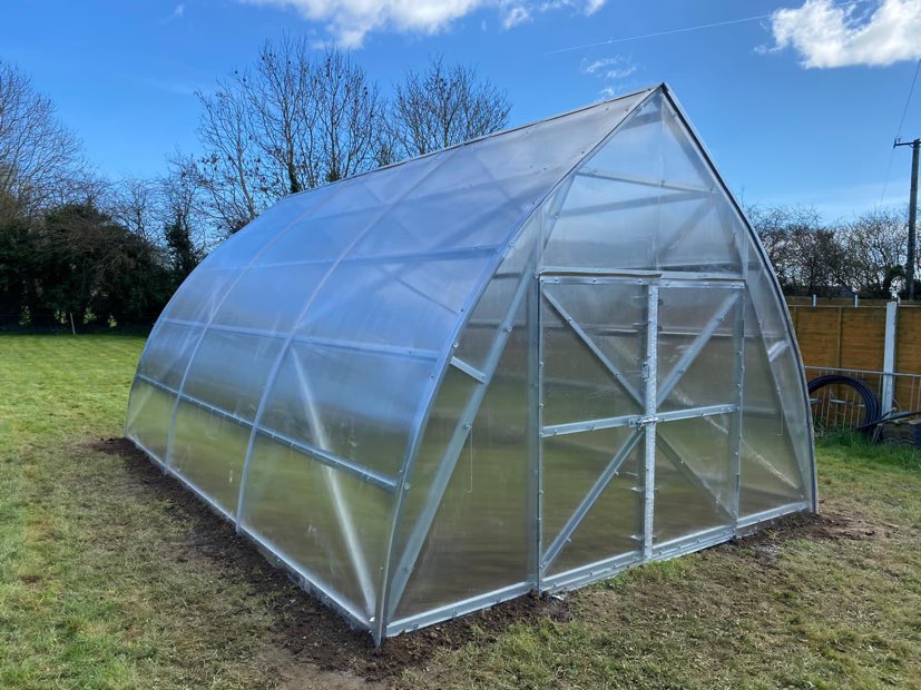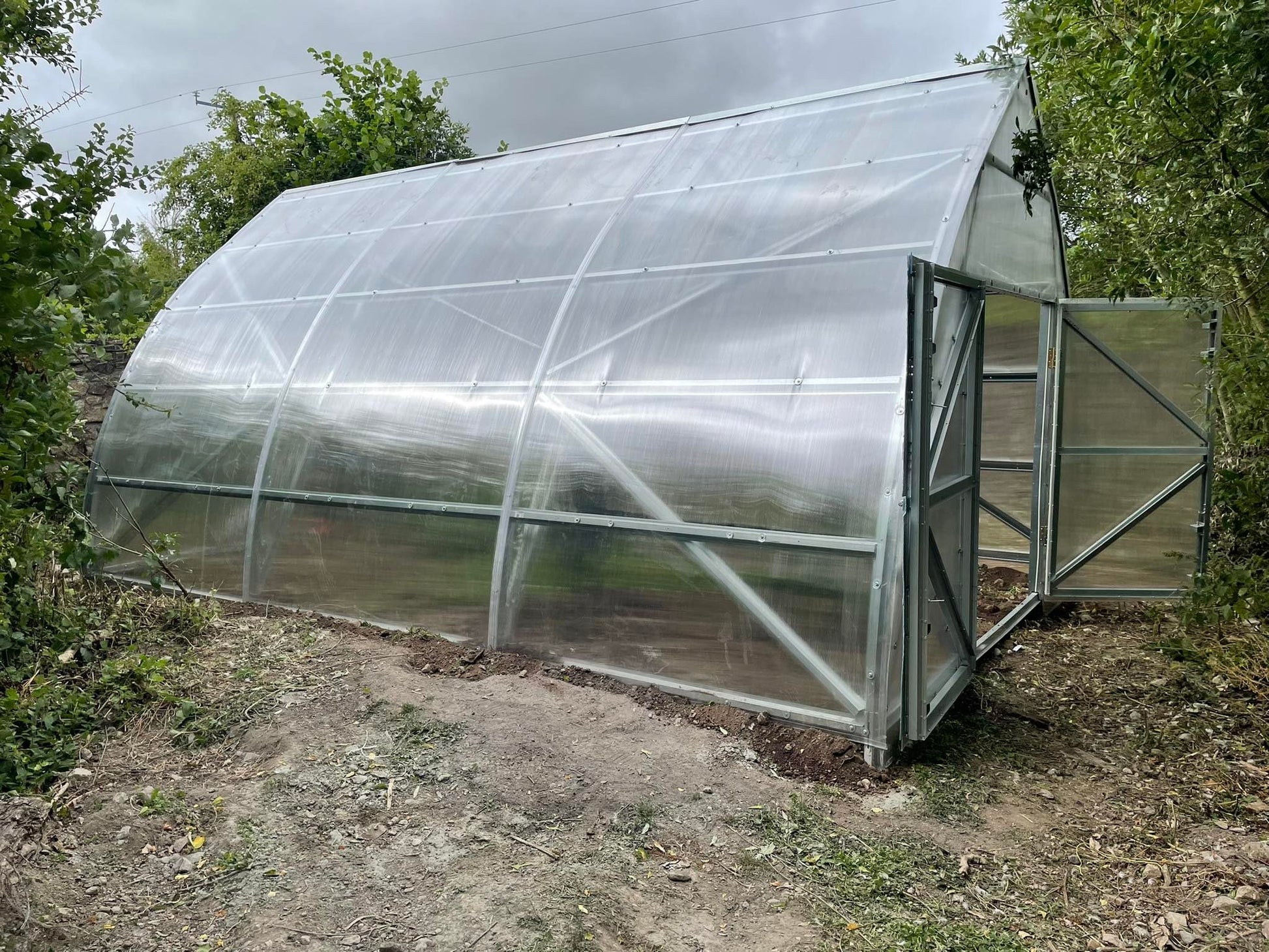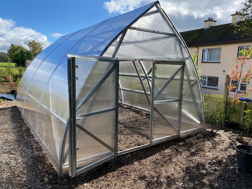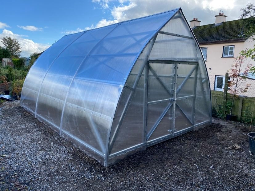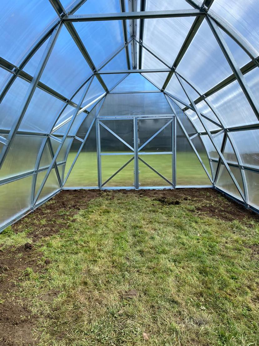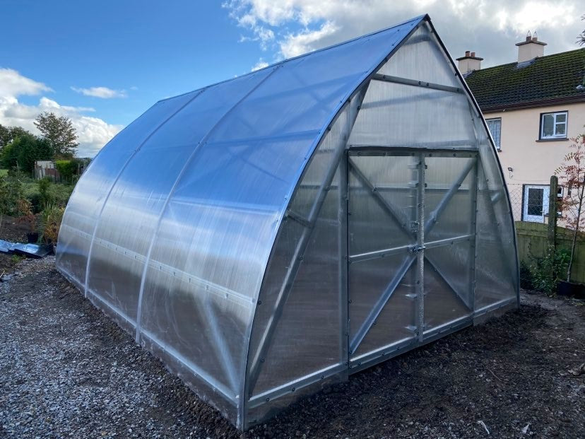 Greenhouse base part width 4.2 m, length depending on desire of buyer starting from 4.2 m and height 3.18m. Door opening width 1.98 m and height 1.93 m.