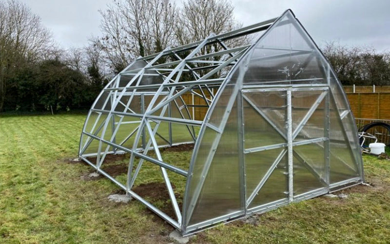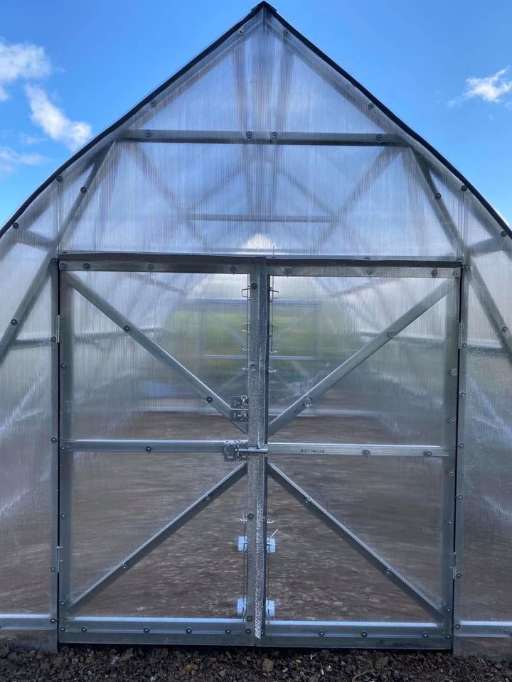The frame is galvanised steel, profile 84×45 mm. The frame is assembled with screws, washers and nuts. The greenhouse base part area is 17.64 m². The length can be extended with additional modules (2.1 m) all the way up to the desired length (6.3 m, 8.5 m, 10.6 m, 12.7 m, 14.9 m…). The greenhouse can be installed on solid foundations (not included) or directly onto the soil with anchors.