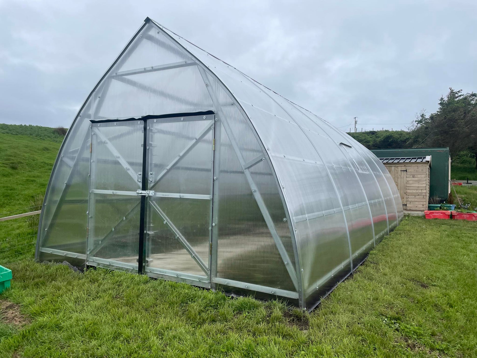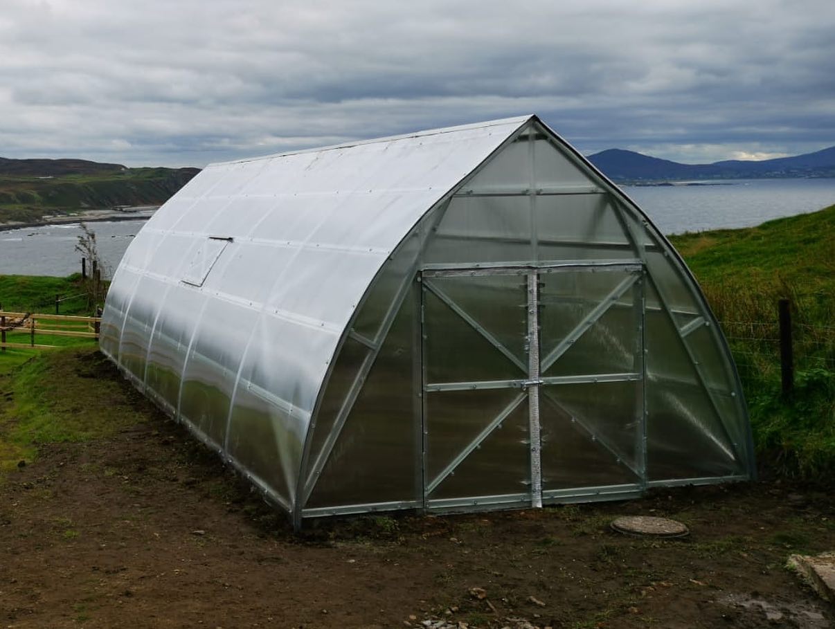The frame is galvanised steel, profile 84×45 mm. The frame is assembled with screws, washers and nuts. The greenhouse base part area is 17.64 m². The length can be extended with additional modules (2.1 m) all the way up to the desired length (6.3 m, 8.5 m, 10.6 m, 12.7 m, 14.9 m…). The greenhouse can be installed on solid foundations (not included) or directly onto the soil with anchors.