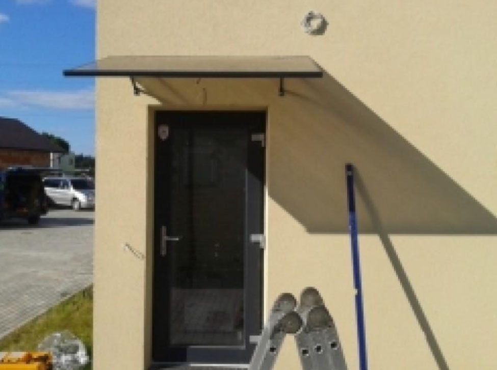 Powder coated grey aluminum construction, with 6mm UV-protected clear polycarbonate cover and gutter.