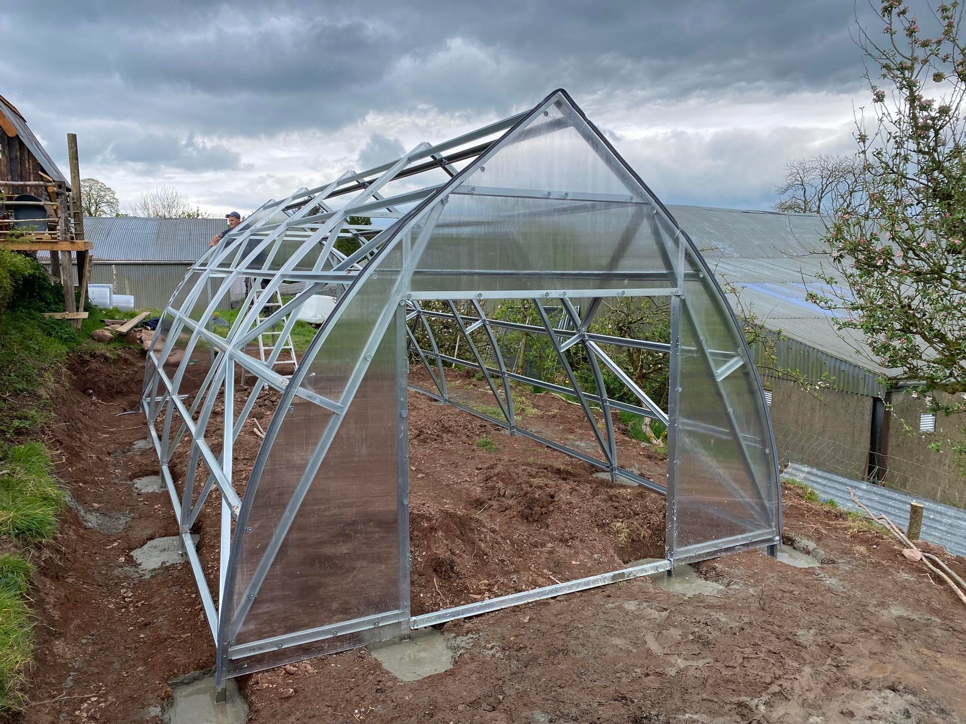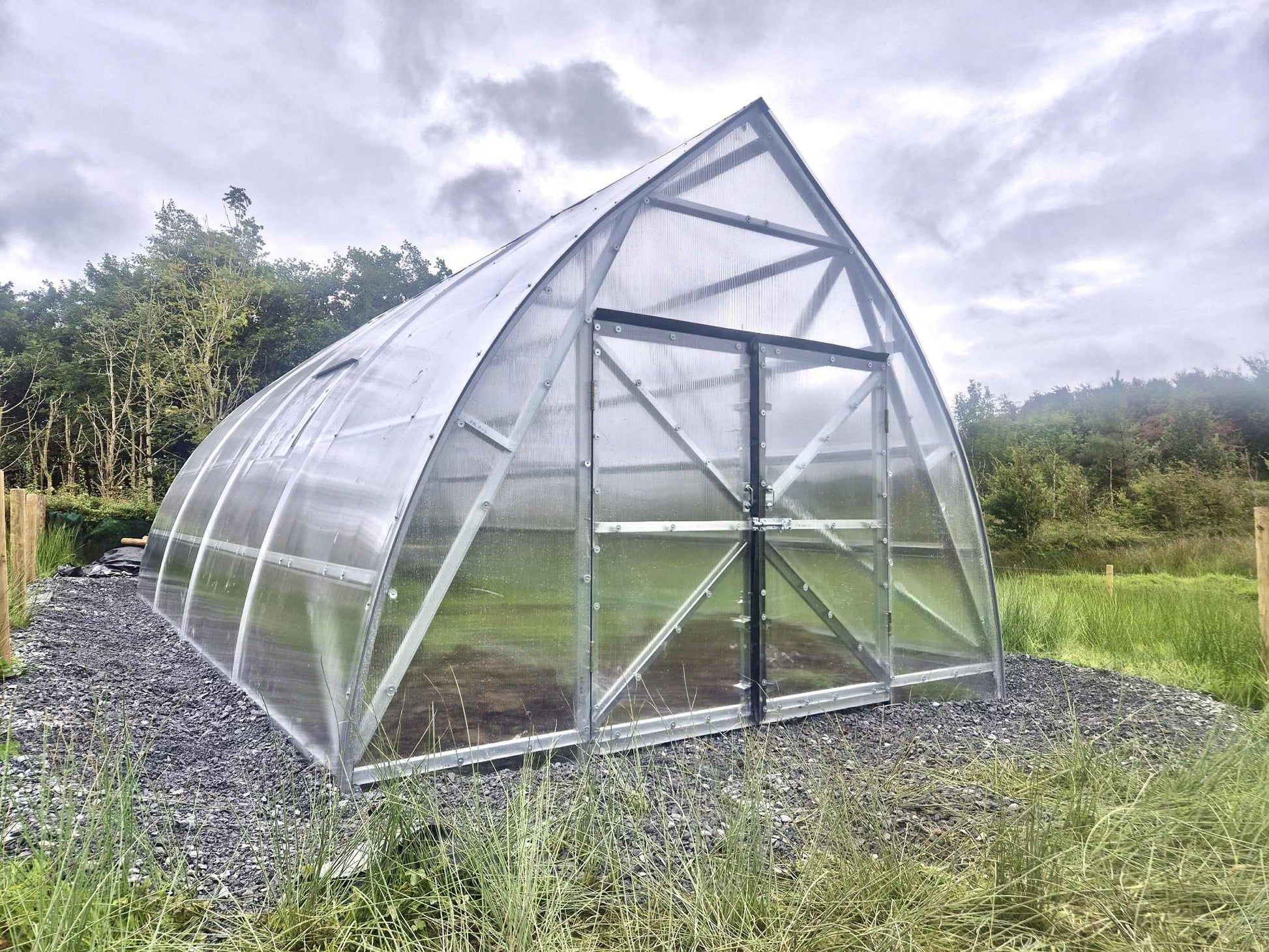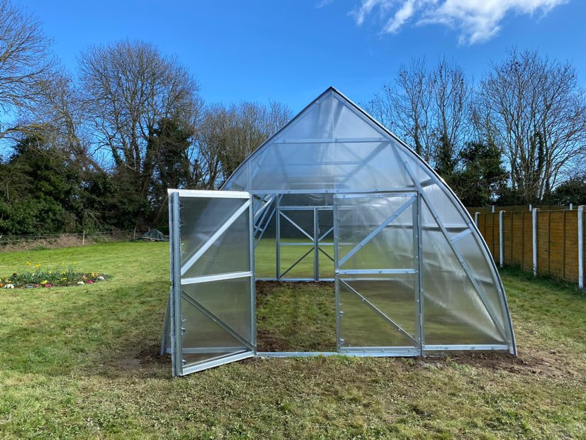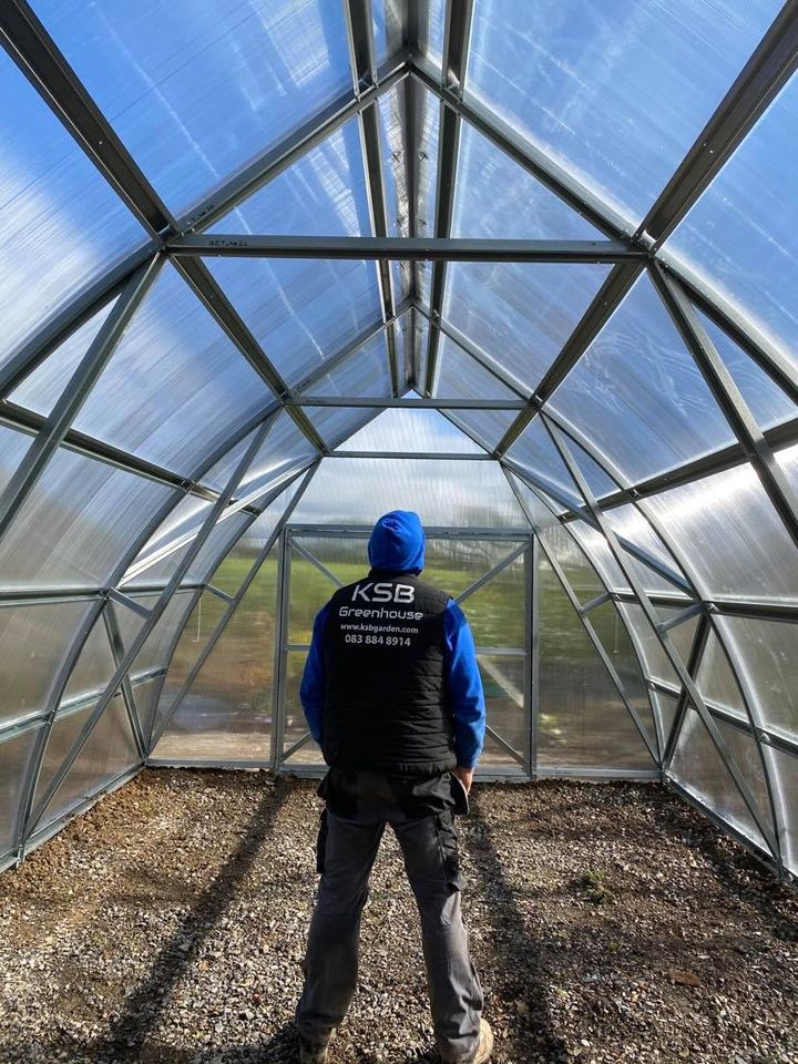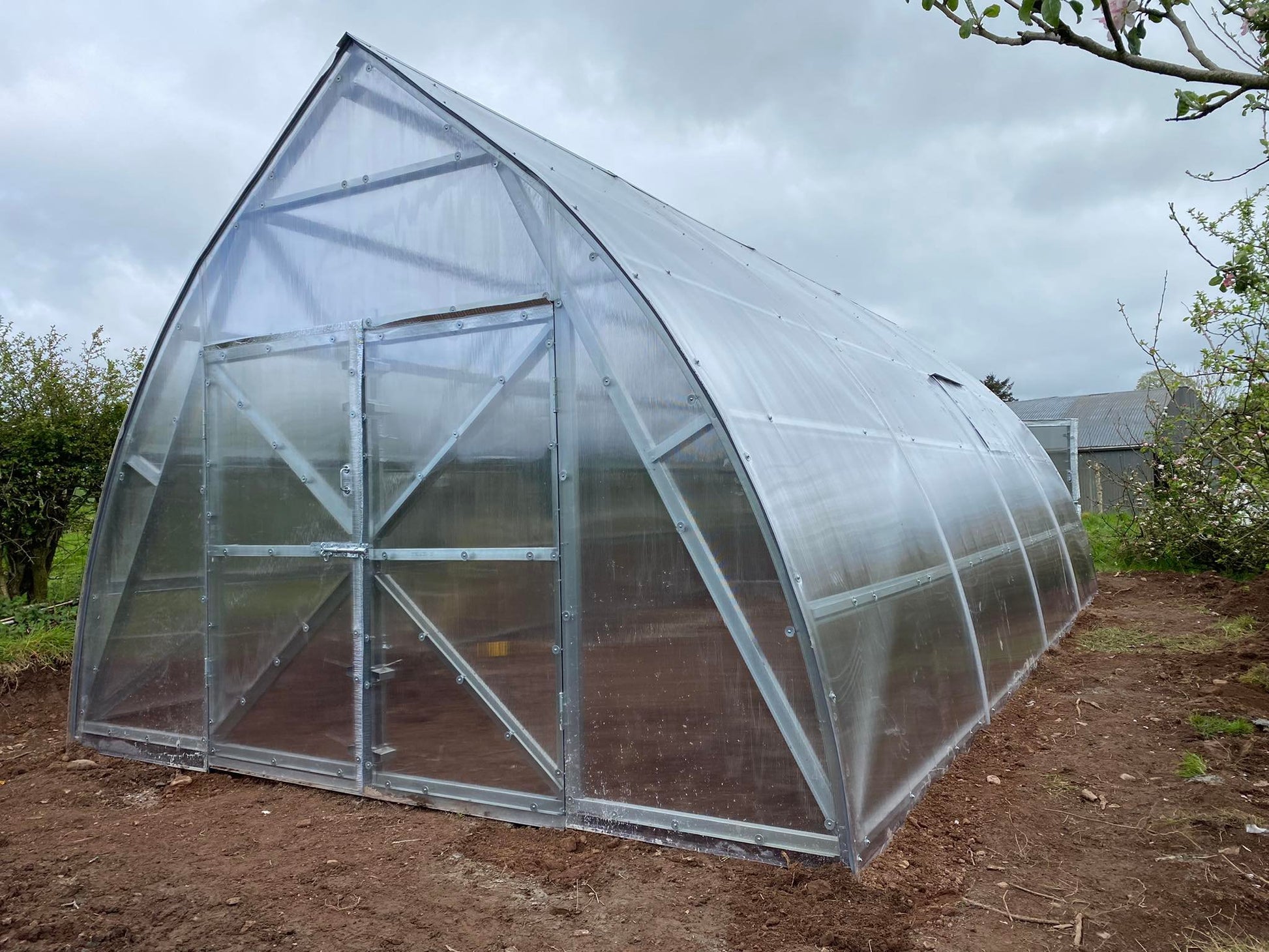 Greenhouse base part width 4.2 m, length depending on desire of buyer starting from 4.2 m and height 3.18m. Door opening width 1.98 m and height 1.93 m.