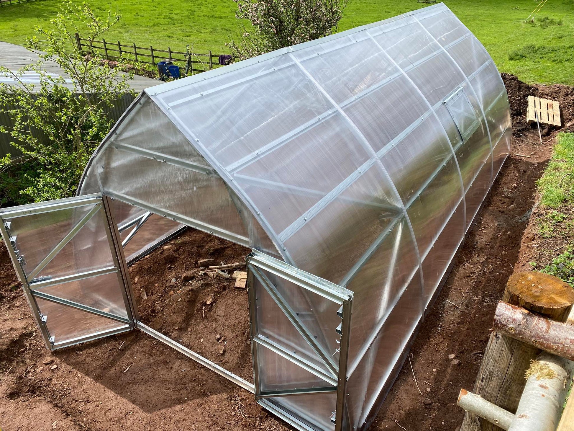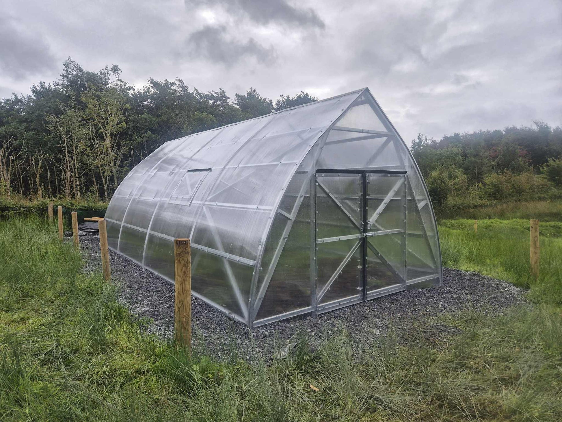 The frame is galvanised steel, profile 84×45 mm. The frame is assembled with screws, washers and nuts. The greenhouse base part area is 17.64 m². The length can be extended with additional modules (2.1 m) all the way up to the desired length (6.3 m, 8.5 m, 10.6 m, 12.7 m, 14.9 m…). The greenhouse can be installed on solid foundations (not included) or directly onto the soil with anchors.