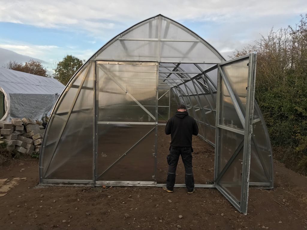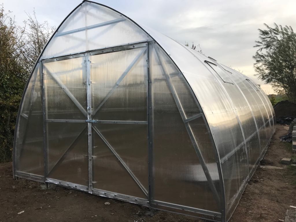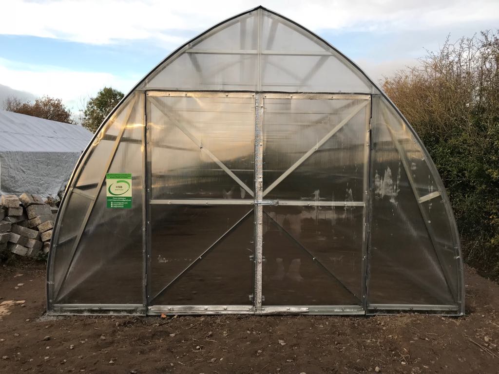 Greenhouse base part width 5m, length depending on desire of buyer starting from 4.2 m and height 3.6m. Door opening width 1.34 m and height 2.6 m.