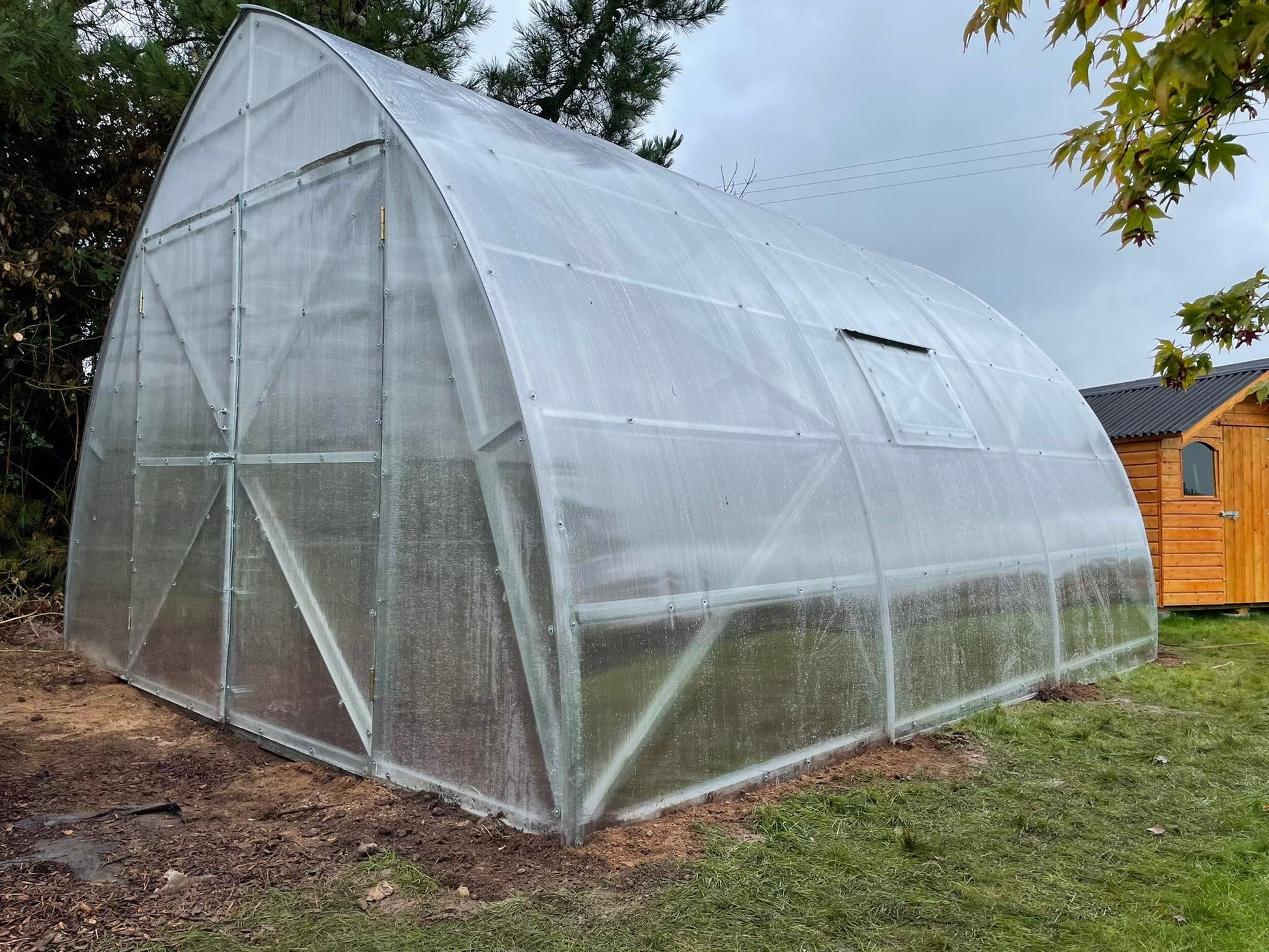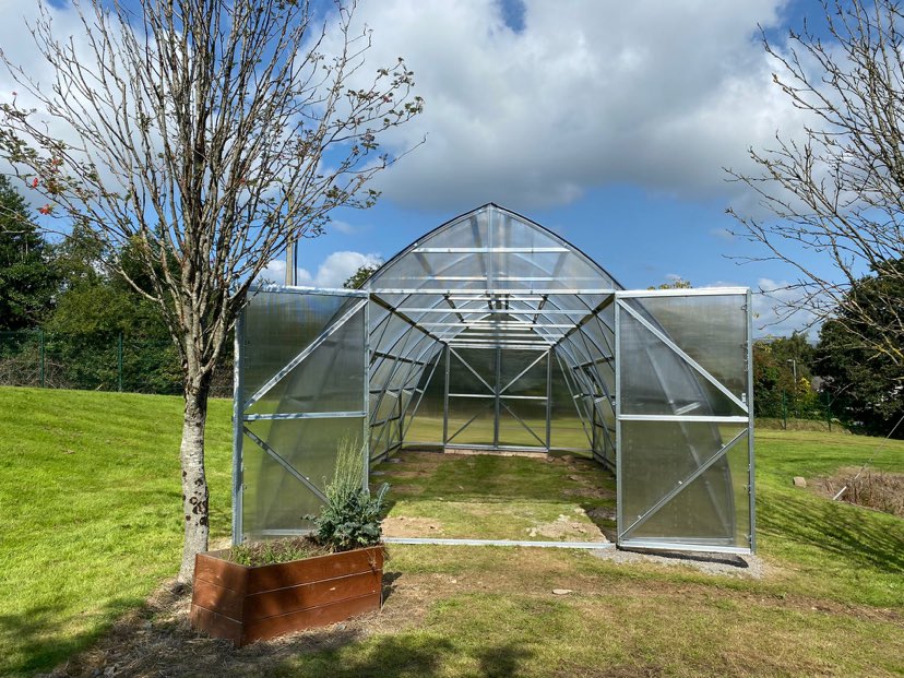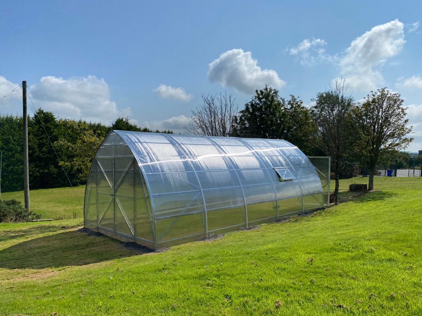 Greenhouse base part width 5m, length depending on desire of buyer starting from 4.2 m and height 3.6m. Door opening width 1.34 m and height 2.6 m.