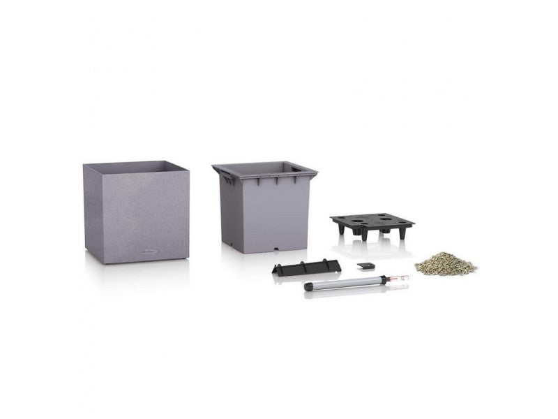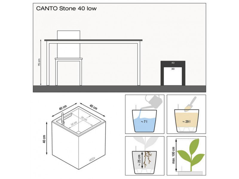 CANTO Stone 30 low CANTO Stone 40 low Dimensions ~ (W x D x H) 30 x 30 x 30 cm 40 x 40 x 40 cm Water reservoir 3 l 7 l Plant volume 12 l 29 l Planter liner, dimension ~ 25 x 25 cm 34 x 34 cm Planting depth 20 cm 25 cm Plant height max. 60 cm 100 cm Characteristics: