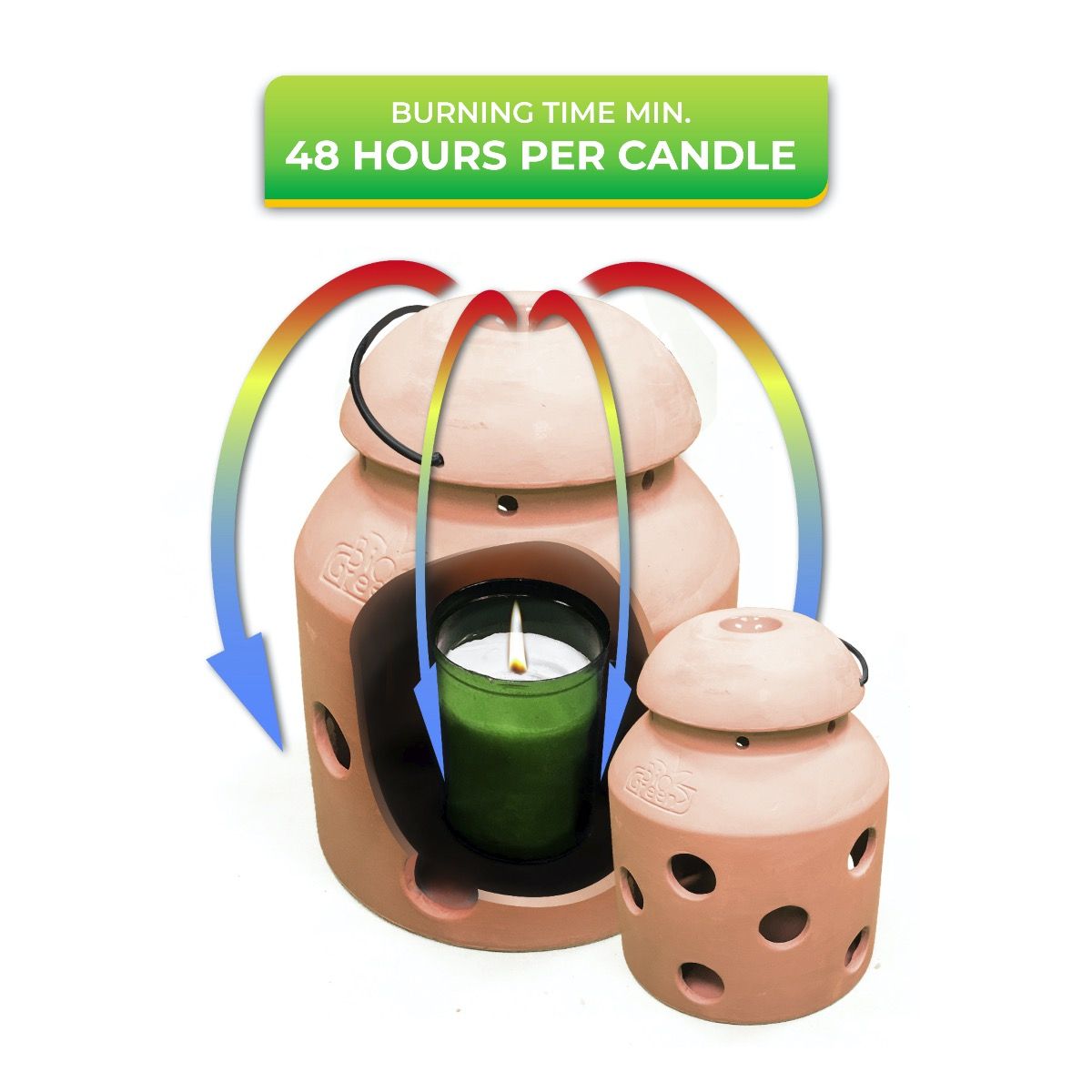 Save energy costs with environmentally-friendly heating; only light the candle when your plants need to be protected from frost. For example, if you are overwintering potted plants in the greenhouse, they will benefit from the radiant heat when placed directly around the FireFly candle , allowing a certain distance for safety.