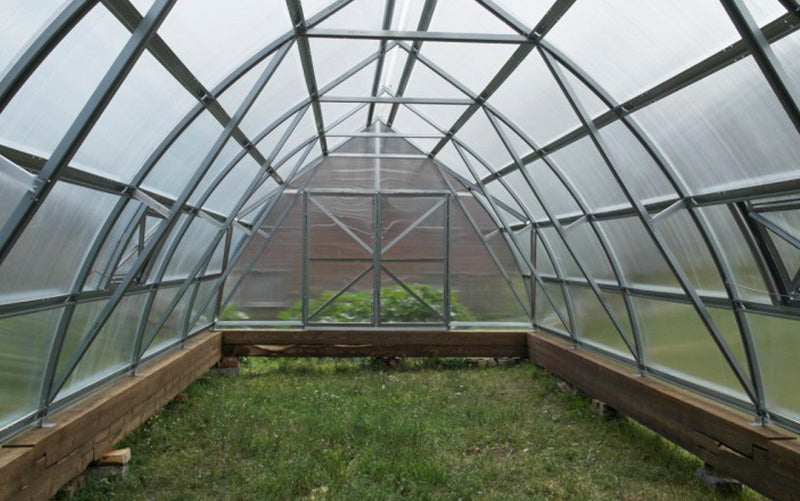 The frame is galvanised steel, profile 84×45 mm. The frame is assembled with screws, washers and nuts. The greenhouse base part area is 17.64 m². The length can be extended with additional modules (2.1 m) all the way up to the desired length (6.3 m, 8.5 m, 10.6 m, 12.7 m, 14.9 m…). The greenhouse can be installed on solid foundations (not included) or directly onto the soil with anchors.