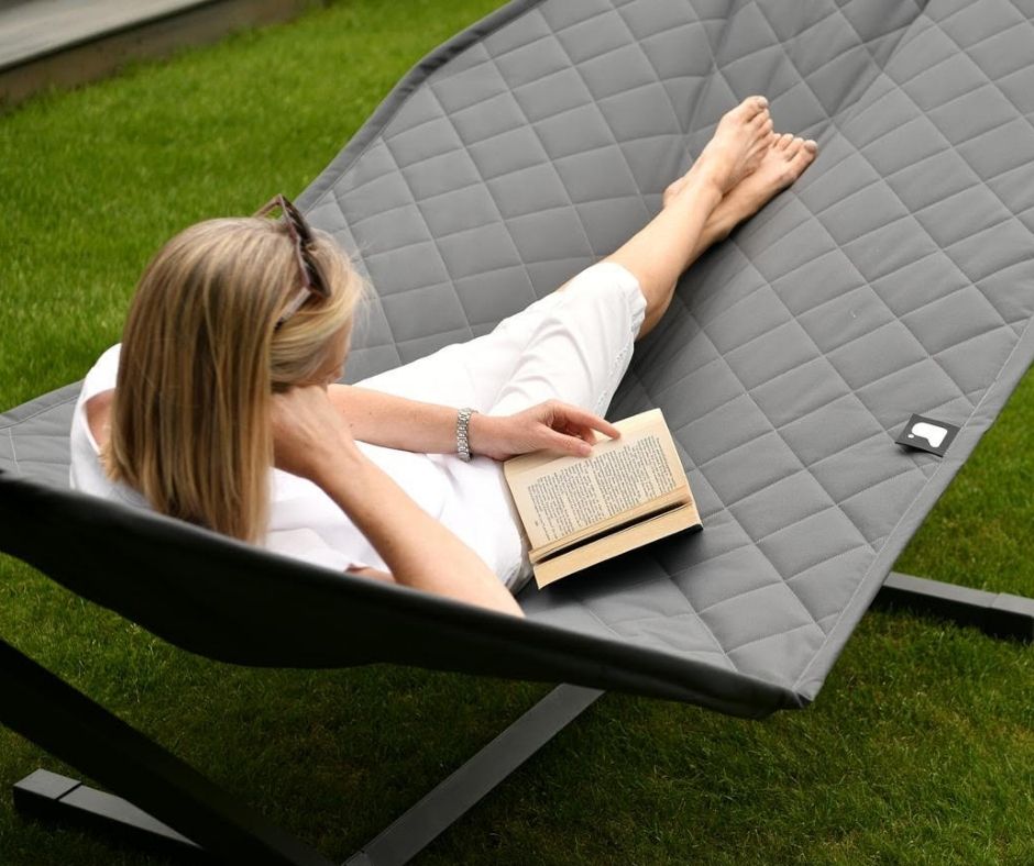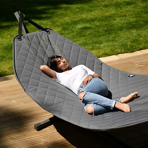 Discover unrivalled comfort with our Extreme Lounging Hammock – your go-to relaxation spot. Its unique laminated fabric can endure rain, while the UV-resistant coating keeps it looking vibrant. Relax in style with a hammock featuring quilted seams, reinforced corners, and rain-friendly design. The sturdy frame, produced in Europe, is built to last. Let the sun shine on your perfect escape!