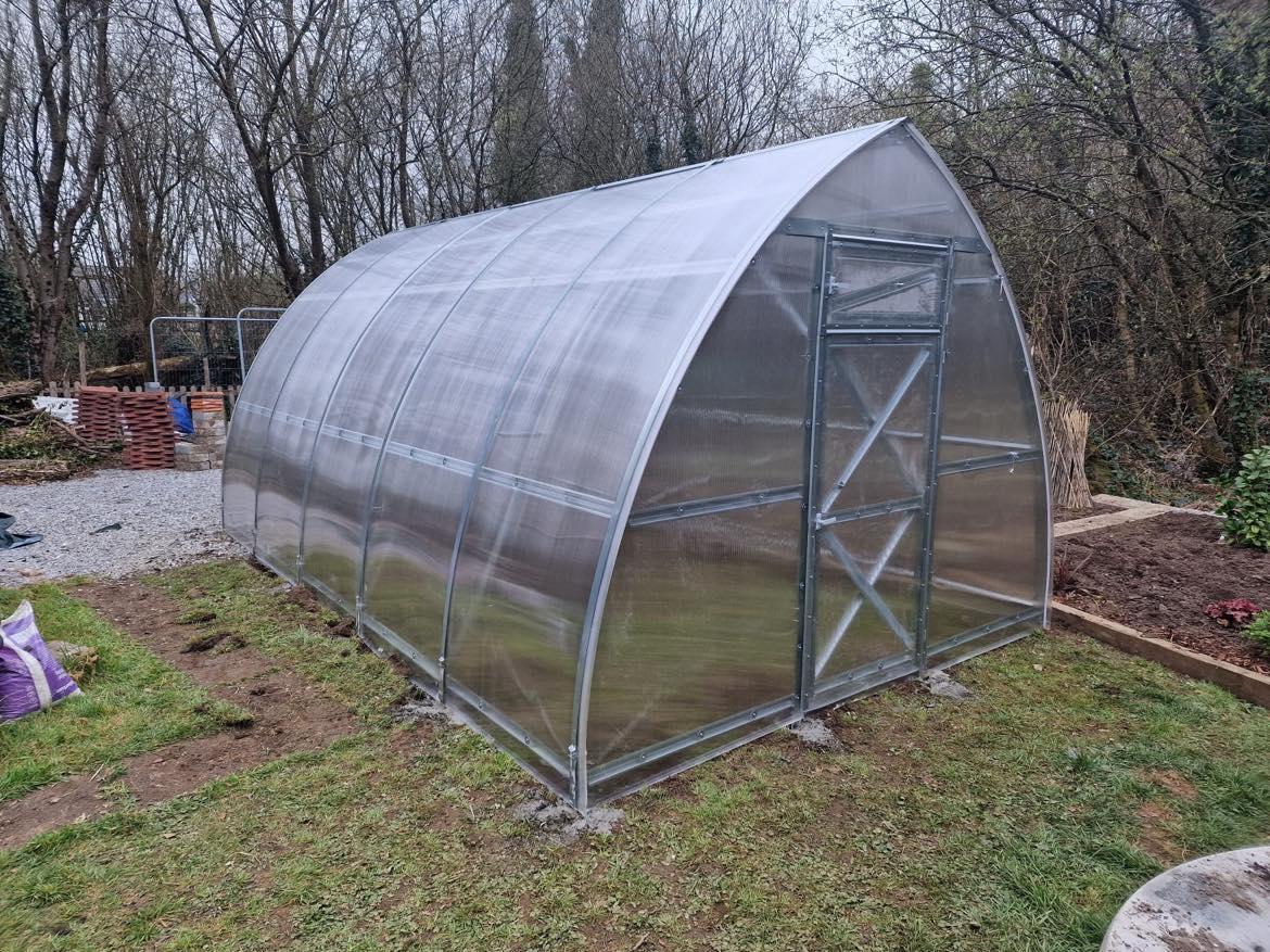 The frame is made of galvanised steel, the profile size is a sturdy 60×20 mm. High quality PC panels manufactured in Europe, 4 mm and UV-protected. The greenhouse is easy to assemble, because it does not require a separate foundation. The vertical beams of the frame are equipped with T-shaped anchors that are dug into the ground.