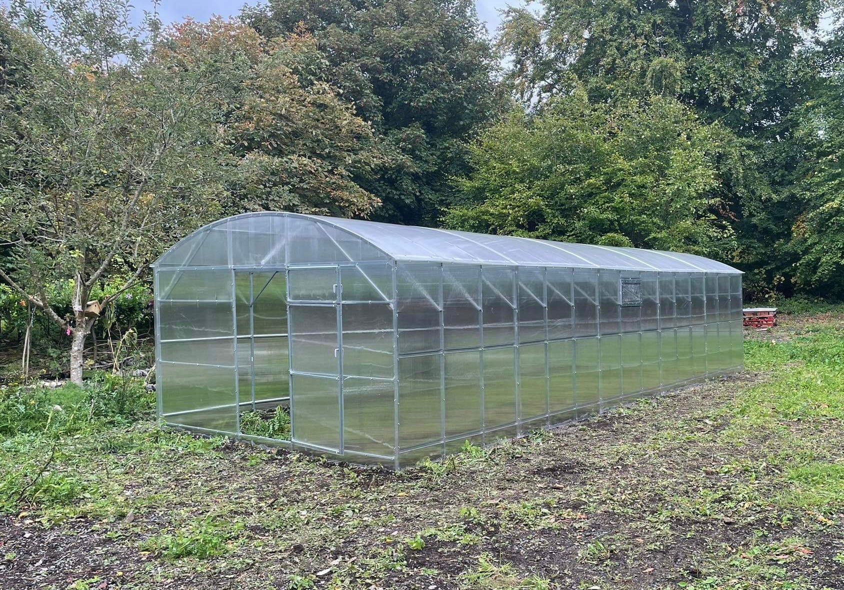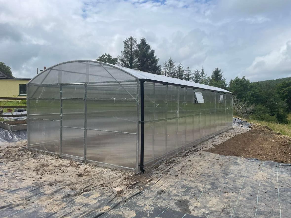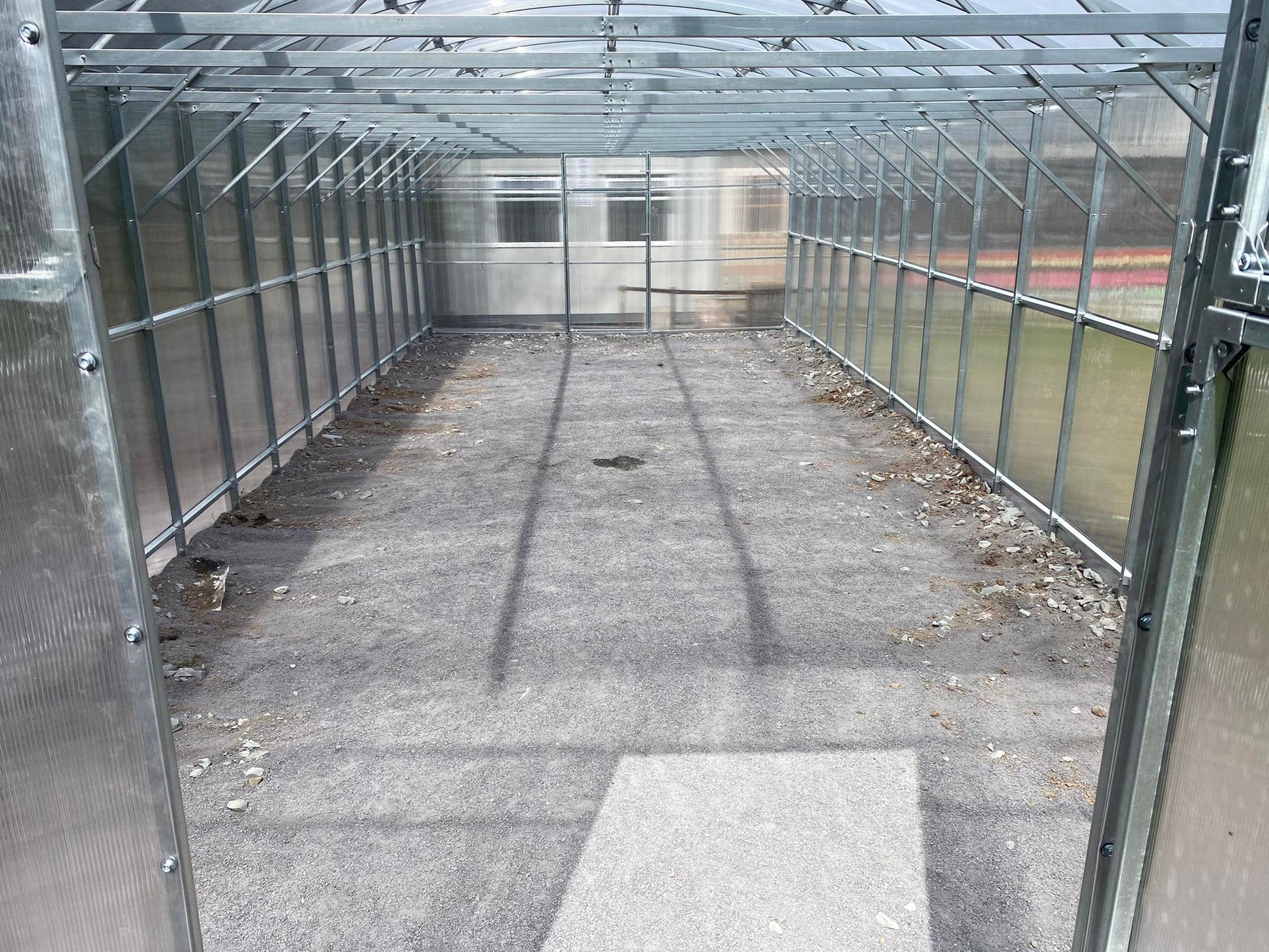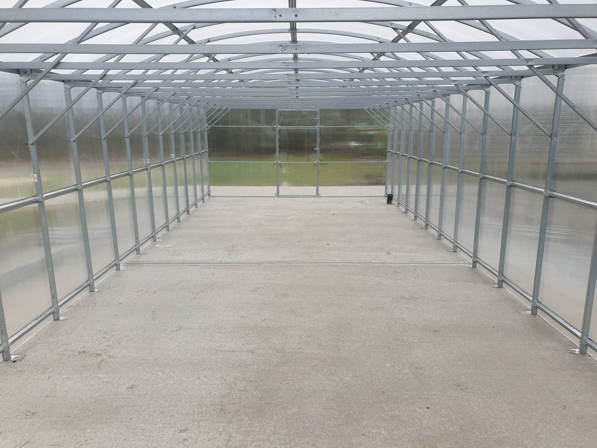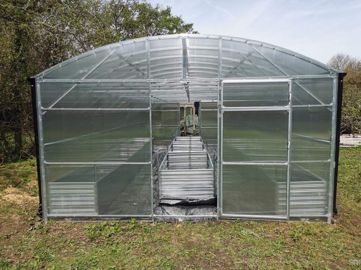 Greenhouse dimensions: width 4 m, length 10 m and height 2.4 m. Area 40 m². Distance between arches is 67cm. Straight walls are 1.97m.