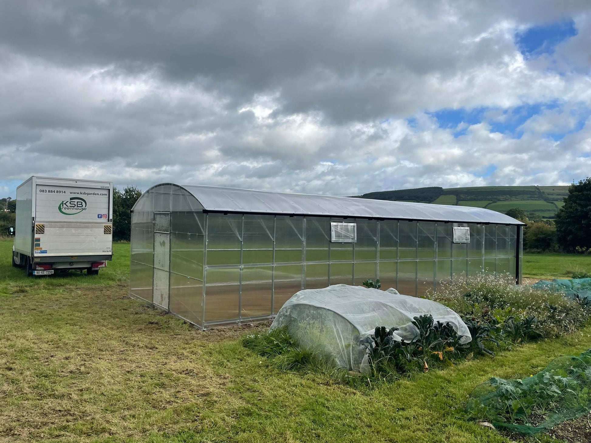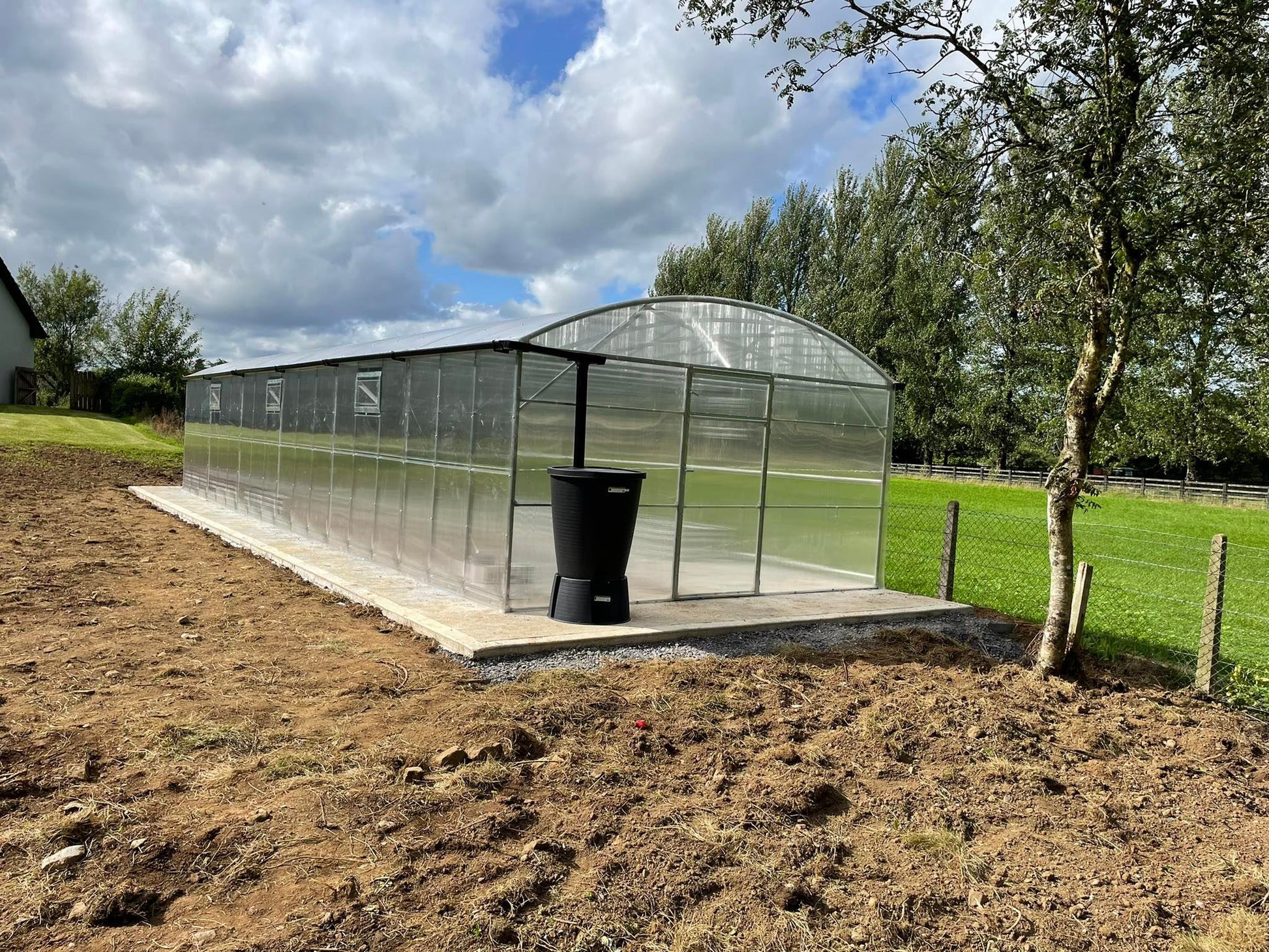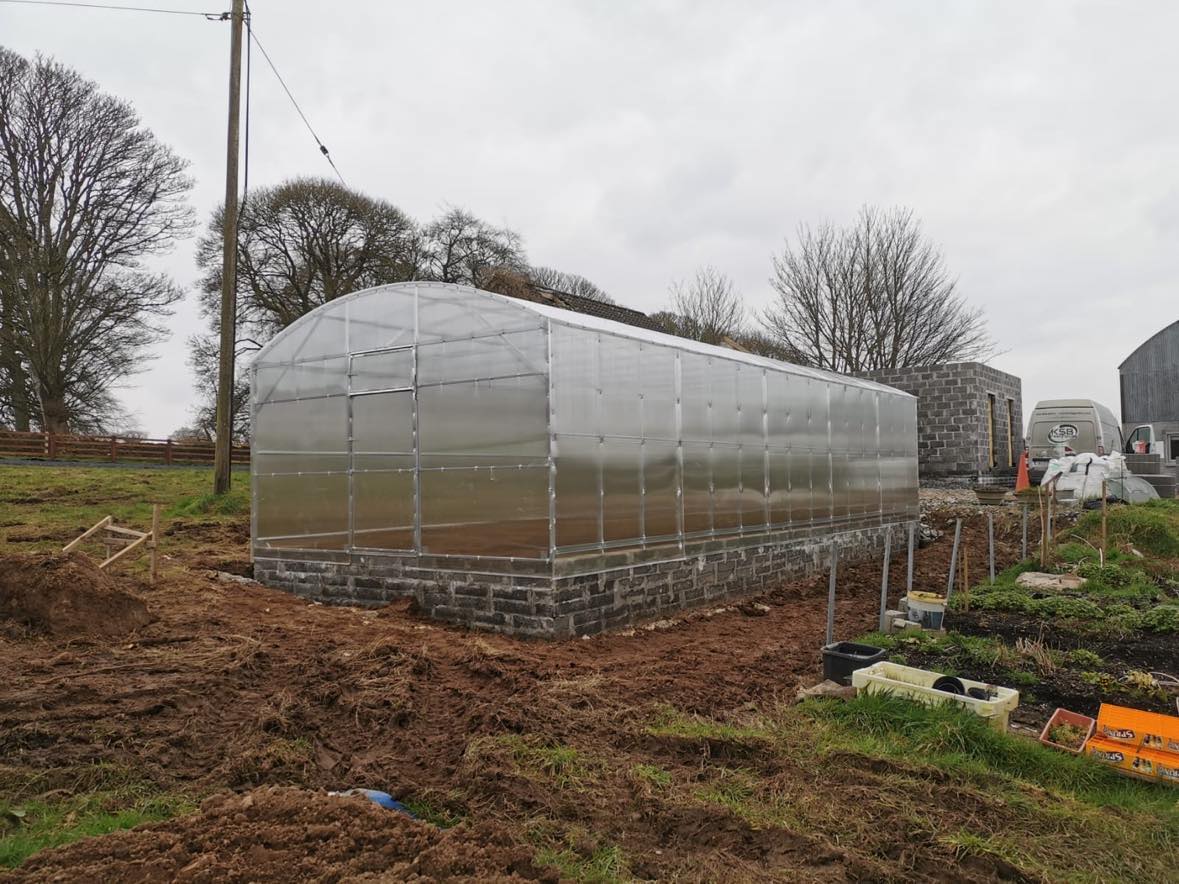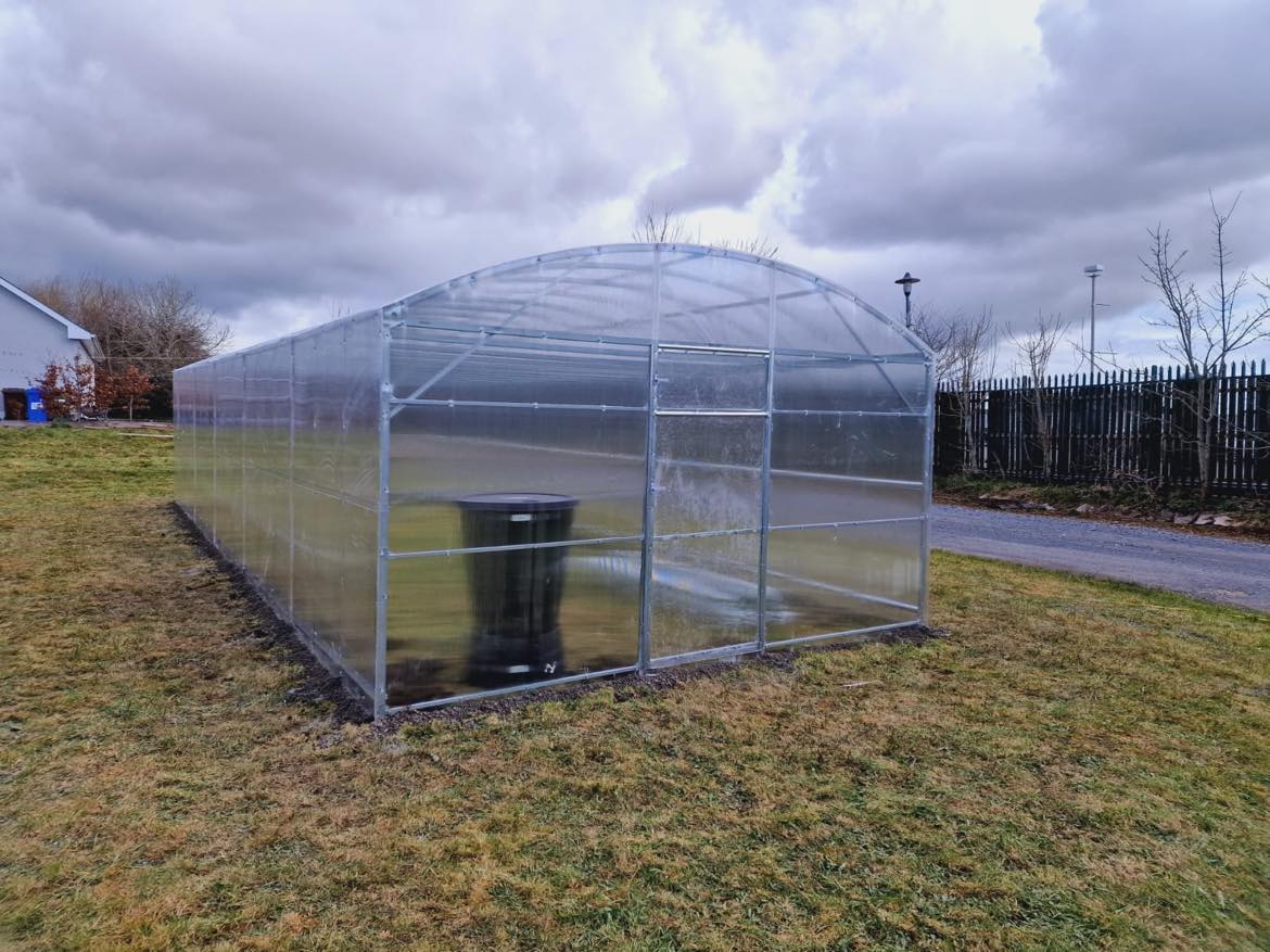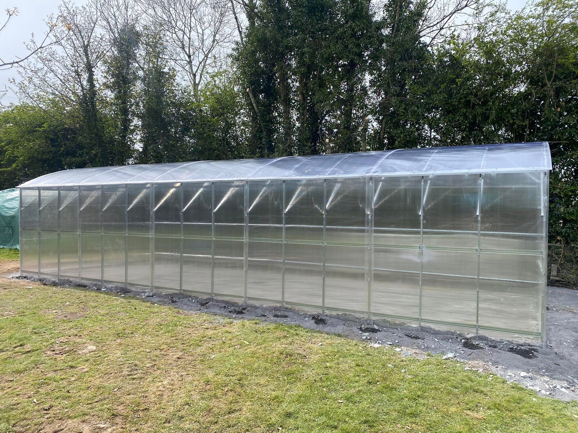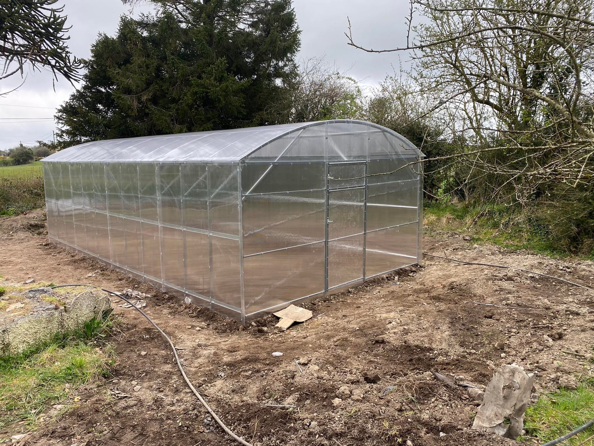 Greenhouse dimensions: width 4 m, length 10 m and height 2.4 m. Area 40 m². Distance between arches is 67cm. Straight walls are 1.97m.