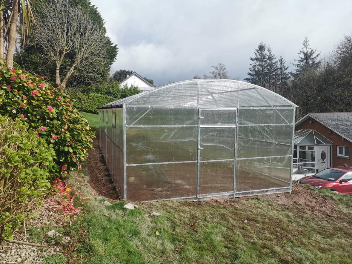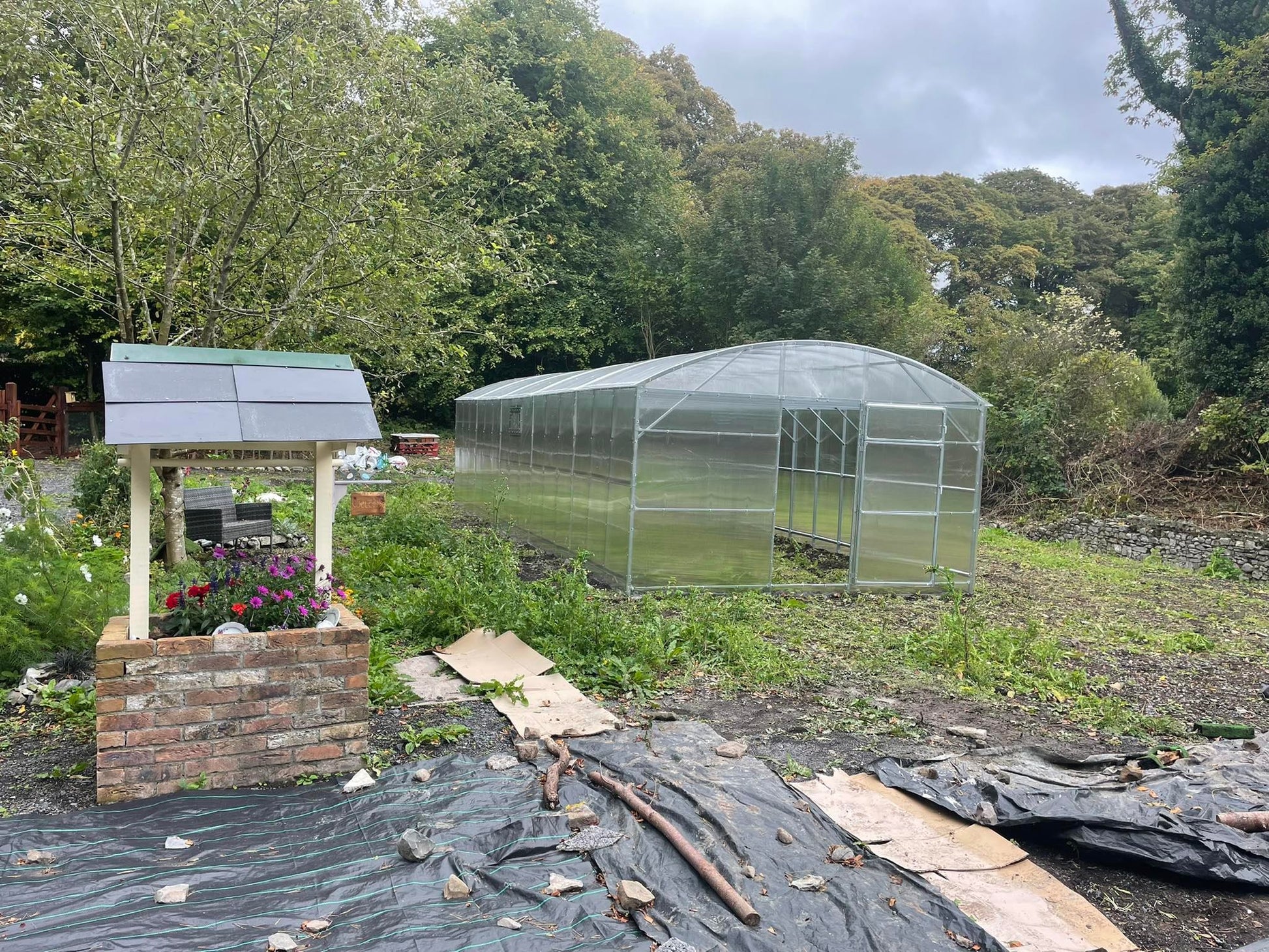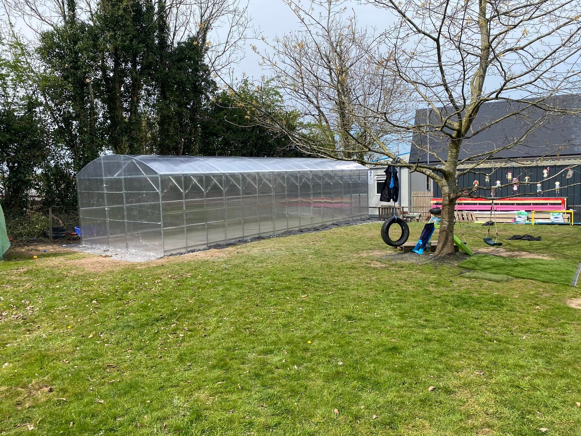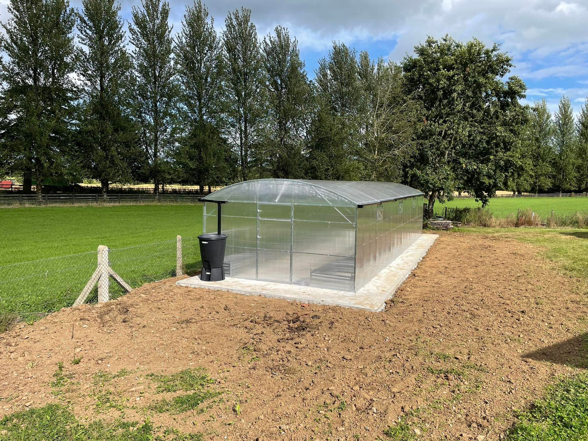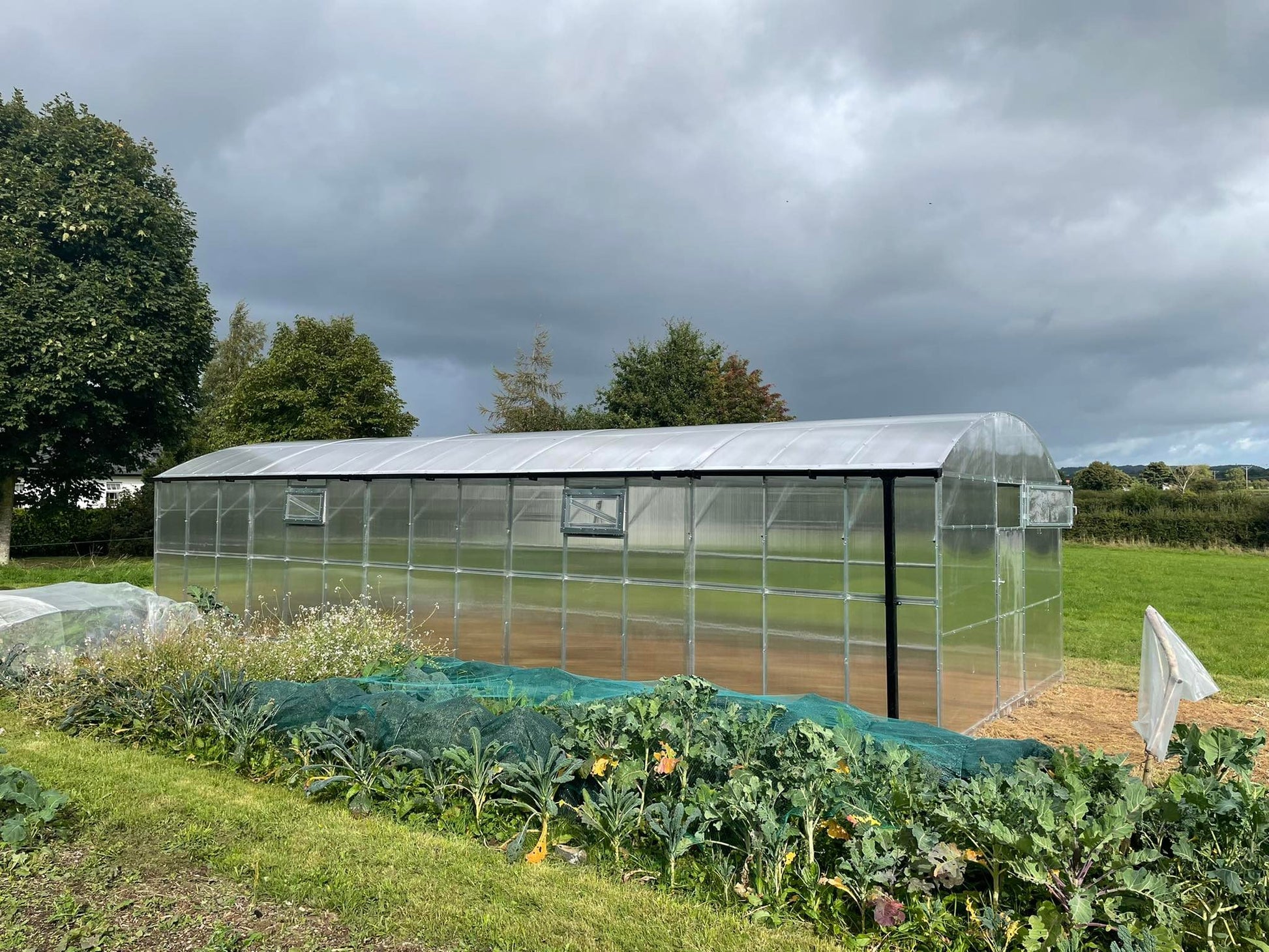 Greenhouse dimensions: width 4 m, length 10 m and height 2.4 m. Area 40 m². Distance between arches is 67cm. Straight walls are 1.97m.