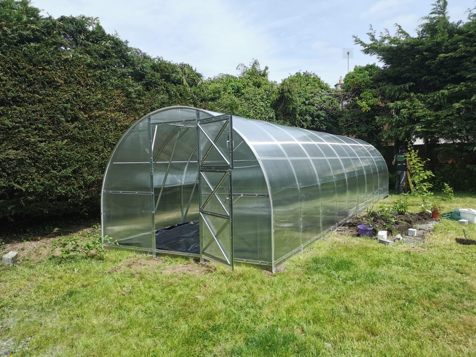 The frame is made of galvanised steel, and is assembled with screws and nuts. High quality PC manufactured in Europe, 4 mm or 6mm and UV-protected. The delivery includes everything needed for mounting the panels. The greenhouse is easy to assemble, because it does not require a separate foundation. The vertical beams of the frame are equipped with T-shaped anchors that are dug into the ground. It can also be installed on a foundation by using angle brackets (not included).