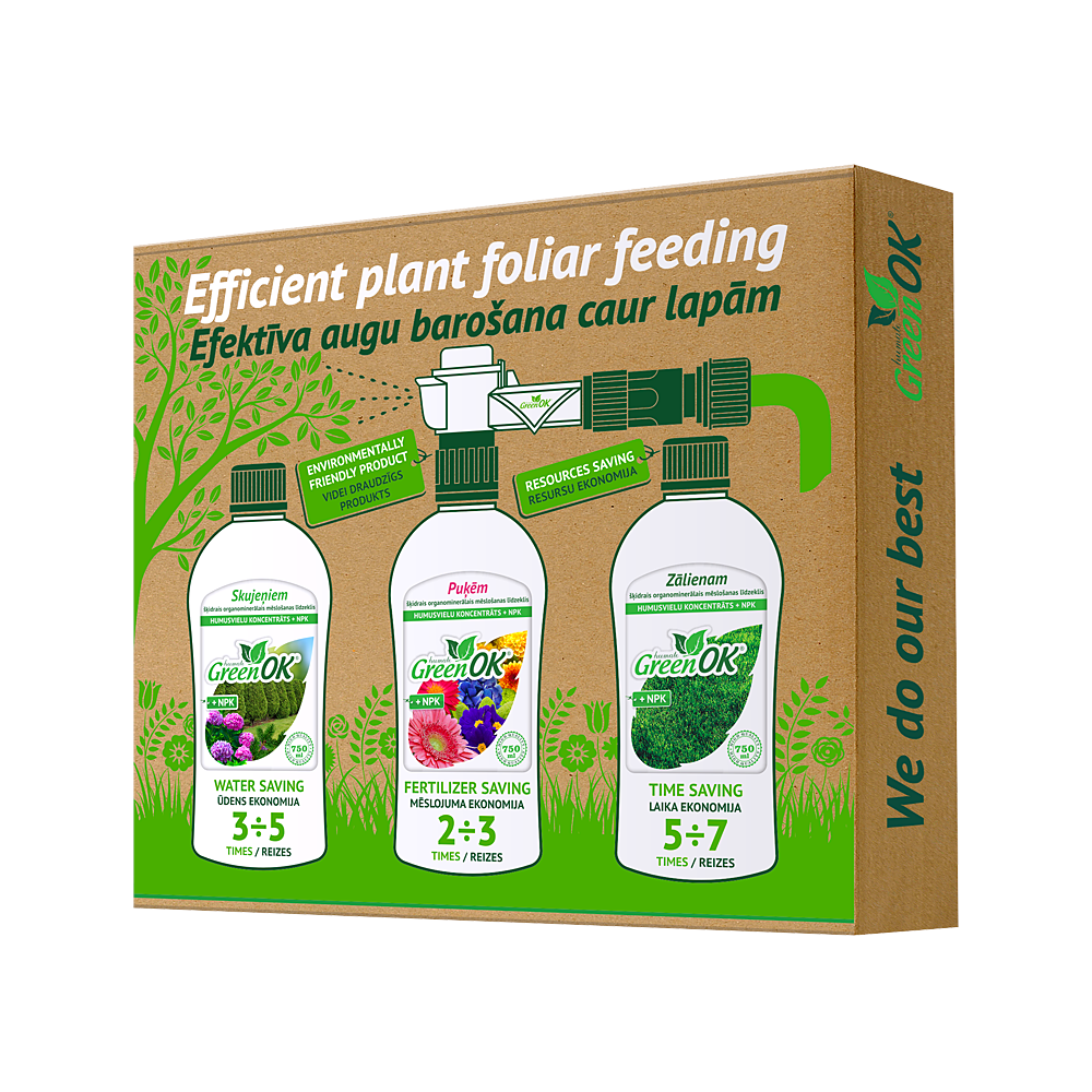 Included: spray nozzle with built-in dispenser and three bottles of 750ml GreenOK spray products.