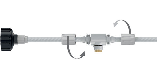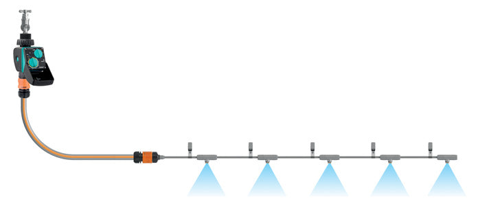 Misting kit ideal for cooling down outdoor spaces on hot summer days. The kit (made up of 7.5 m of hose, 6 micro-mist nozzles, connectors and fitting clips) can easily be hooked onto sunshades, gazebos, parasols and greenhouses and connected to the tap (using an extension hose fitting that is not provided). The micro-mist sprayers, with brass nozzles, release a vapour of microscopic drops of water into the air, which allow the atmosphere to be cooled by up to 6°. The kit also includes the battery-powered Aquauno Mist timer, which automatically turns on the cooling system at regular intervals. Operating pressure: 3-6 bar.