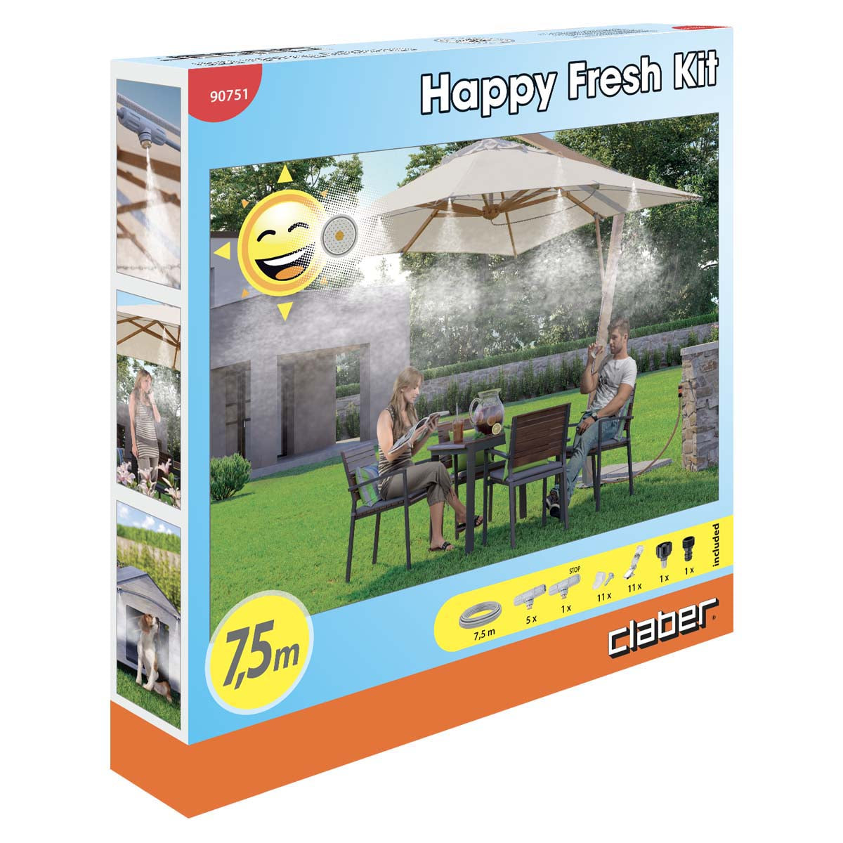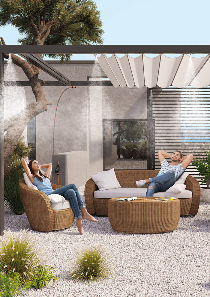 Happy Fresh is the practical kit designed by Claber to cool down hot summer days. The efficiency of the micro-mist nozzles means that the microscopic drops of water released into the atmosphere can reduce the temperature, creating a feeling of wellbeing on even the hottest days.