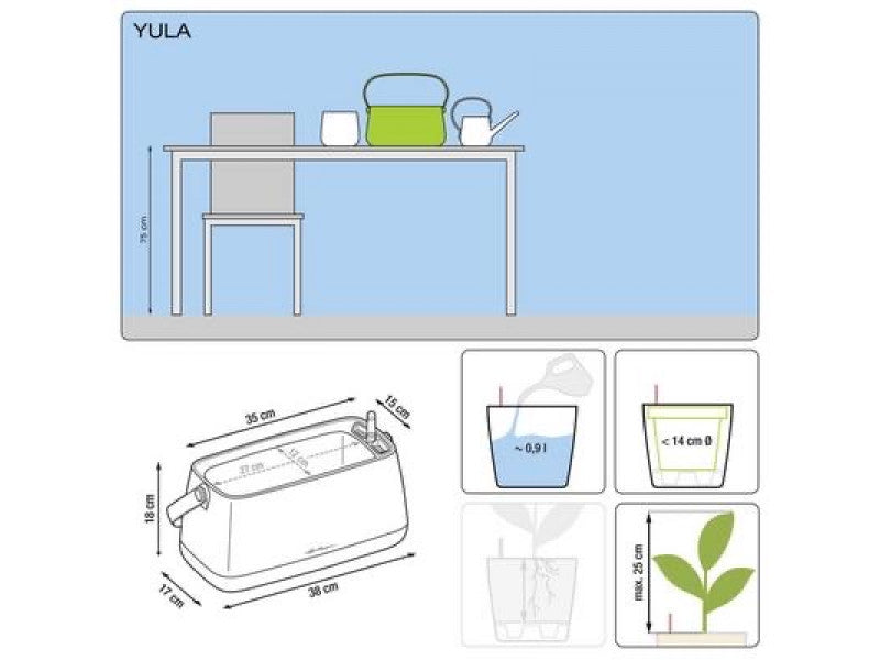 This makes the YULA containers ideal for anyone who wants to decorate their home with plants but does not have green fingers. Thanks to the simple sub-irrigation system, plants can be exchanged and redecorated at any time - perfect for a new, individual look every time! In the handy table pot format, there is room for the YULA family everywhere.